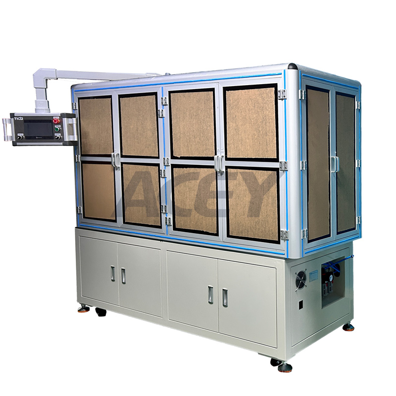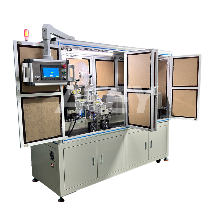 ACEY-ASM-1C automatic shrink sleeve machine with safety cover is suitable for automatically applying heat shrink tubing to AA, AAA, cylindrical 18650, 21700, 26650, and other steel-cased lithium batteries.. It automatically applies heat-shrink sleeves onto the batteries through a servo feeding system, punches and inserts insulation pads into the sleeves, and then passes the cells through the heat shrink oven, where they can rotate for uniform shrinking. Afterward, a reserved station allows for inkjet marking, and the finished batteries are discharged to the buffer station. Once the buffer is full, the batteries are automatically pushed into plastic trays.