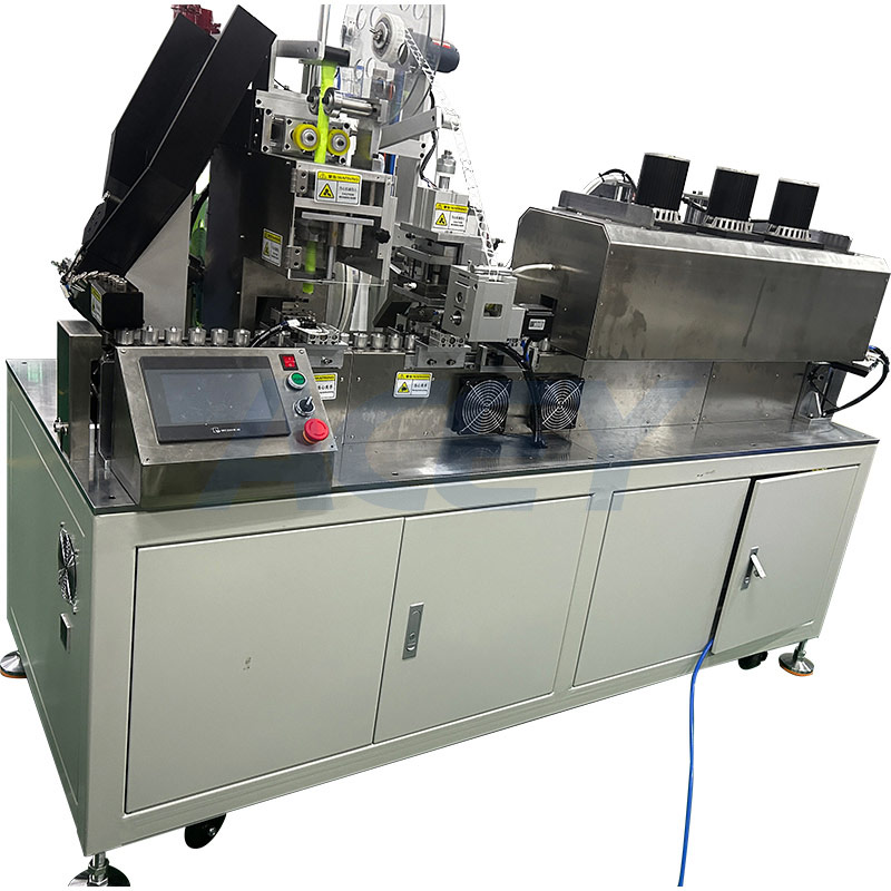 ACEY-ASM-1 shrink sleeve applicator adopts a fully automatic box-feeding system. Once the equipment is reset and started, it runs continuously in automatic mode. During each intermittent stop, the batteries are precisely positioned by pneumatic clamps. The servo feeding system automatically applies the heat-shrink sleeves onto the batteries. At the next station, during the stop phase, insulation pads are automatically punched and inserted into the sleeves. The cells then pass through the heat shrink oven, where they can rotate for uniform shrinking. Afterward, a reserved station allows for inkjet marking, and the finished batteries are discharged to the buffer station. Once the buffer is full, the batteries are pushed into trays automatically.