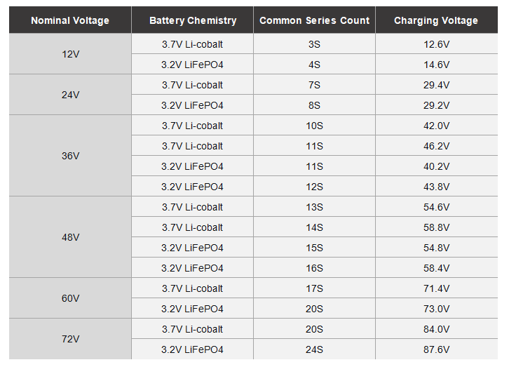 For example, 7.4V, 12V, 24V, 36V, 48V, 60V, 72V, etc.
