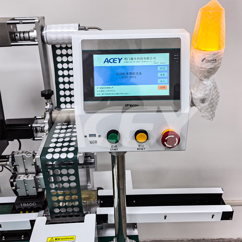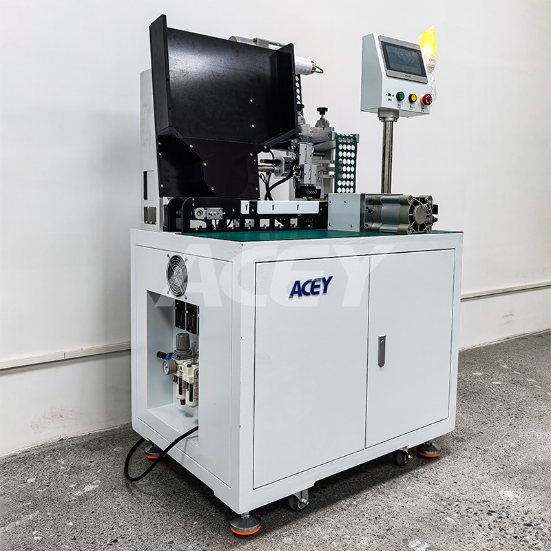 ACEY-BS01 cylindrical cell fish paper warpping machine is designed for automatically applying fish paper pads or PVC insulation to the positive or negative terminals of 18650 cells. By replacing the mold, it can also be used for other cylindrical cells—such as 21700, 26650, 32650, 32700, and more—to perform automatic insulation paper application.
